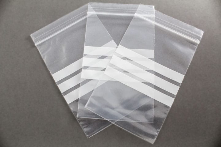 Bolsas de autocierre con franjas para escritura, transparentes y reutilizables. Ideales para organizar y etiquetar objetos con facilidad.